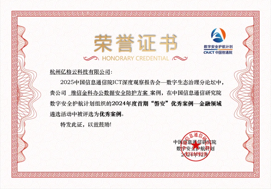 近日,中国信通院ICT深度观察报告会在北京国际会议中心圆满举行,在数字生态治理分论坛上,2024年度首期“磐安”优秀案例——六大行业应用优秀案例遴选结果发布。亿格云的“维信金科办公数据安全防护方案”案例成功入选,被评选为金融领域2024年度首期“磐安”优秀案例,这也标志着亿格云在办公安全领域提升数据安全层面取得了重要肯定。
