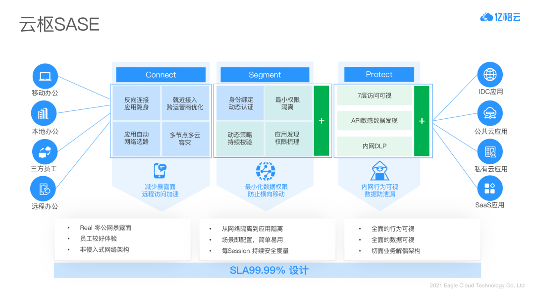 公司基于“身份、终端、网络、资源、数据”五大维度,构建了整个 SASE 架构。帮助企业了解自身数据资产,降低安全风险系数,把权限进行最大化动态控制。基于这种控制,可建立企业数据分类、分级体系,全场景地审计数据流转、使用情况等。