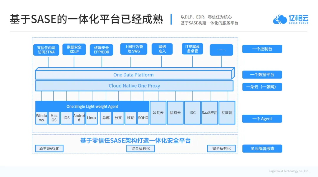 亿格云产品负责人沈隆表示,亿格云一体化终端安全平台的目标是实现原生融合,通过底层集成多种安全能力,实现信息共享,提供全方位的防护,从而带来更优秀的体验、更高的效率和技术的更强可控性。率先展开AI大模型在数据安全领域的探索与实践,帮助企业在数据分级分类以及安全风险运营上摆脱原有人工逐个检验、排查方式,转变为自动化辅助分析以及研判,极大提升了效率。亿格云通过SASE架构构建的一体化办公安全平台,使安全能力无缝融入业务流程之中。