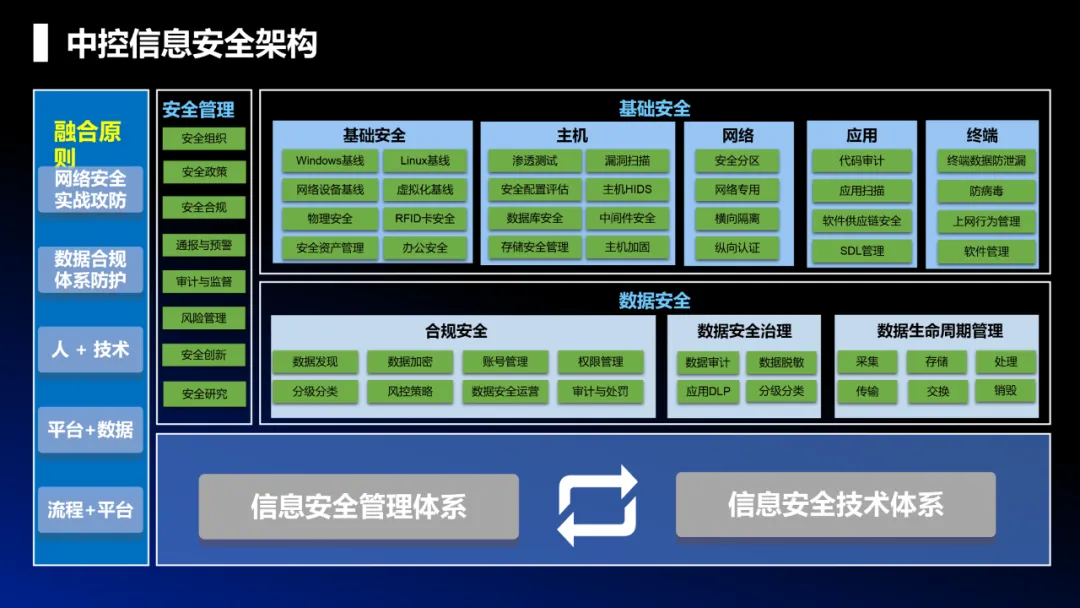 随着会议如火如荼的展开,中控数科IT基础设施部经理杨二磊带来了《中控信息安全实践》的深度分享,信息安全治理是“一把手”工程,从管理、技术体系双轮驱动建设信息安全,详细介绍了公司的信息安全建设框架,他特别指出,文化建设在信息安全建设中必不可少,因为“人”是最重要的环节。在信息安全防护架构层面,他从网络边界、终端防护、数据中心、监控审计等方面切入。
