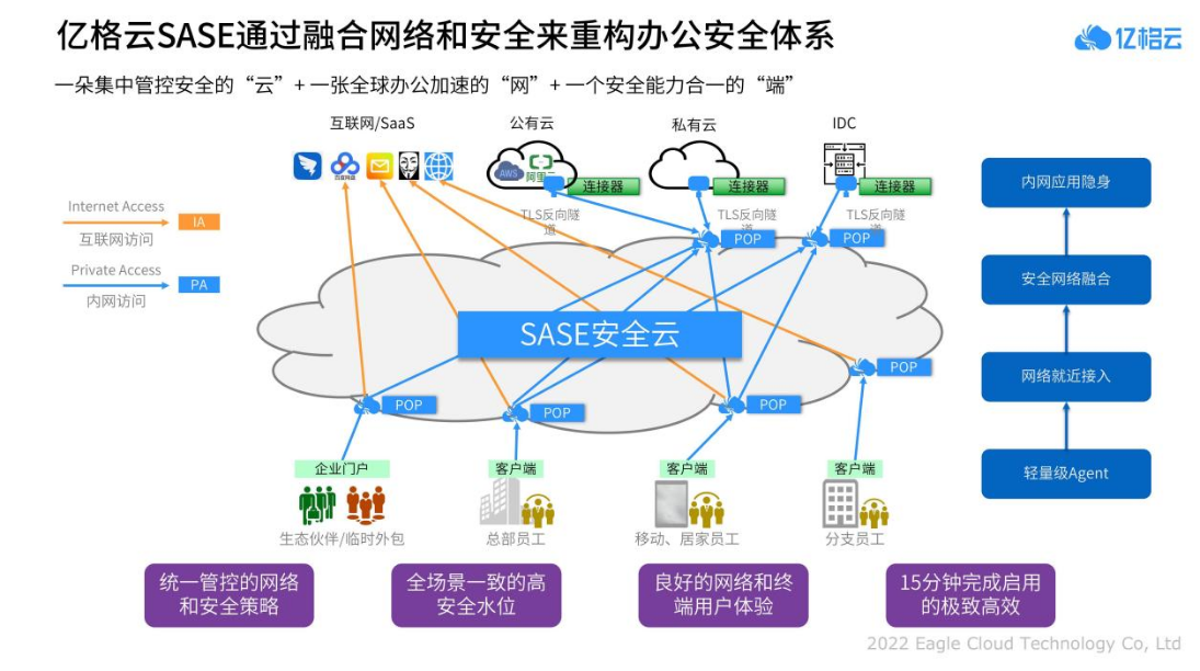 为了实现综合丰富的功能和足够丝滑的体验,葛岱斌基于亿格云长期的探索积累和客户服务经验,向我们重点介绍了构建SASE优势的三大要领: