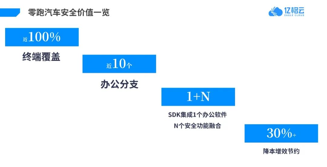 “零跑作为拥有全域自研能力的科技型智能电动车企,对于核心数据的保护至关重视。经过测试以及深思熟虑后选择了亿格云,这个周期并不是很短。我们基于亿格云枢SDK集成,结合公司的IT规划需求共同打造的集成式终端一体化解决方案——“凌界”,像远程接入、外设管控、数据安全管理、合规检查、终端杀毒、终端检测等主要的安全功能都可实现,此外,凌界平台在‘降本增效’方面也给我们带来了惊喜。低于预期的整体安全运营成本评估。也一定程度上提升了办公效率。”
